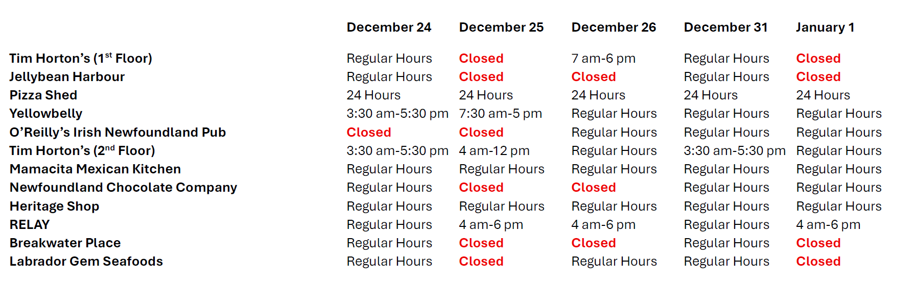 | JellyBean Harbour | Level 1 | Offers the latest bestsellers, unique souvenirs and convenience items. | 709-753-0873 |